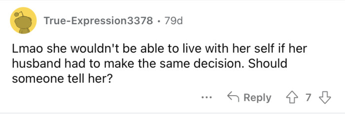 Reddit/MindlessNote3735She explained that her friend almost died during childbirth, and her husband was forced to decide between saving her life or their baby's. He chose his wife and the baby didn't survive.