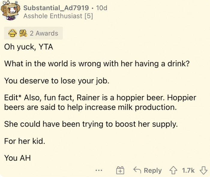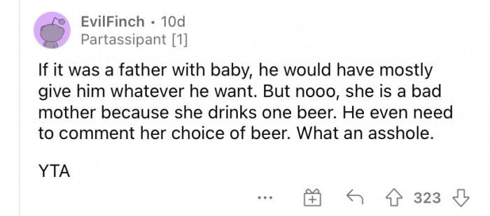 She explained to the Redditor that she had previously been to the restaurant with her husband and their baby, and there had never been an issue with ordering alcohol. She also told him that she had worked in restaurants herself, so she knew there was nothing illegal about her ordering a beer.
