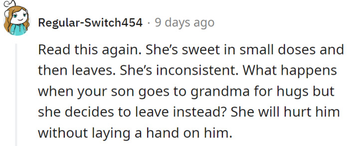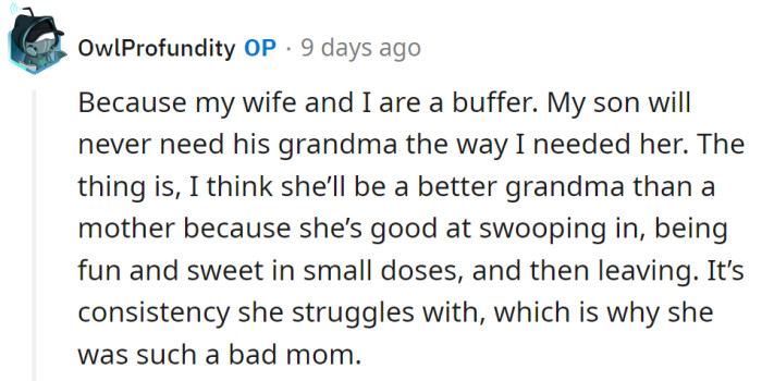 However, the tables turned three years ago when the man passed away. Suddenly alone, the mother aimed to rebuild her relationship with the OP, particularly focusing on their newborn son.