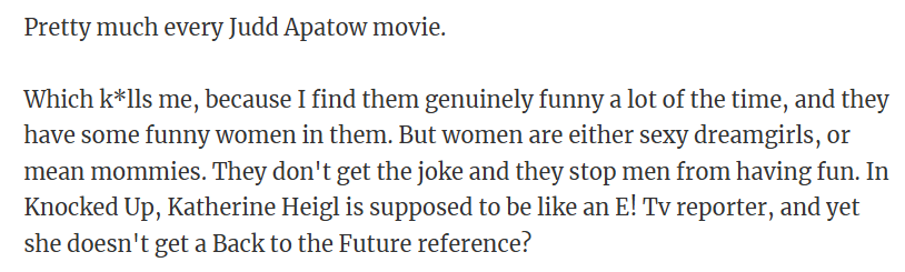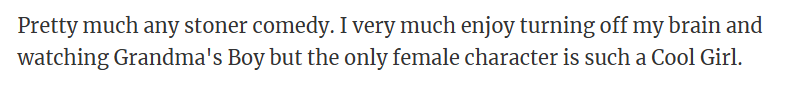 "Anything with 90% of men being the protagonist and the overly-objectified women who are only there as love interests. "