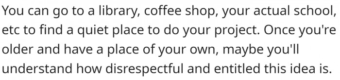 "You can go to a library, coffee shop, your actual school, etc., to find a quiet place to do your project."