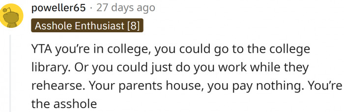 They explained their situation: "My dad is part of this folk band that has rehearsals every once in a while at our house. Recently, they've been having rehearsals quite often since they have a concert coming up. So they're coming over today for the fourth time this month or so, and my parents didn't tell me until this morning."