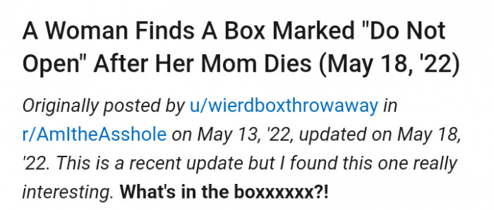 This was the case for a woman who found a box marked "Do Not Open" after her mother's death. A discovery like this can certainly get anyone's mind racing — what could be so bad that the owner would want it hidden away?