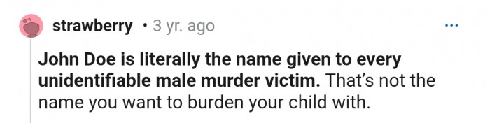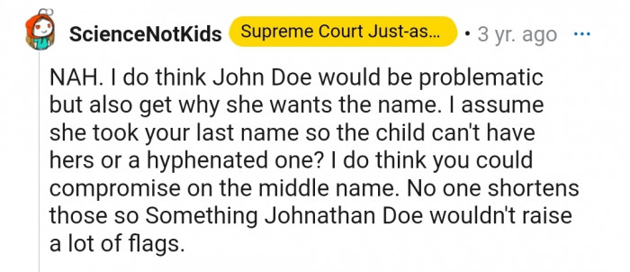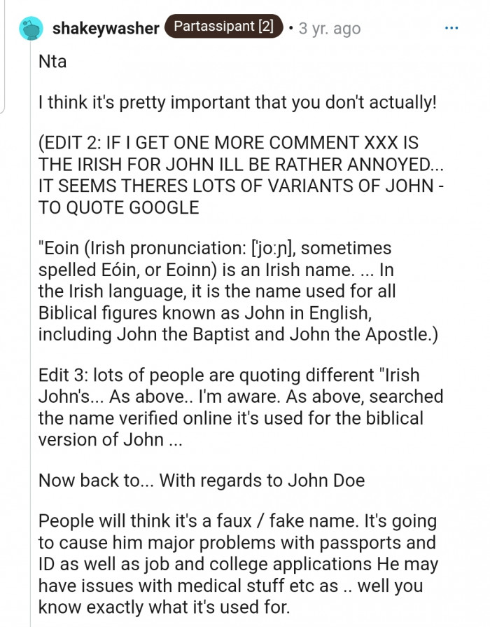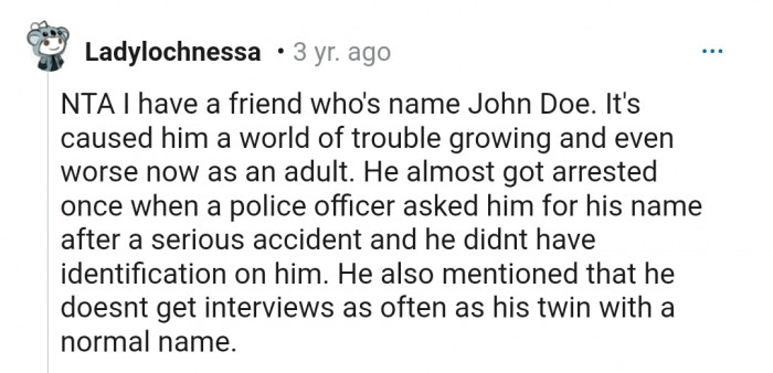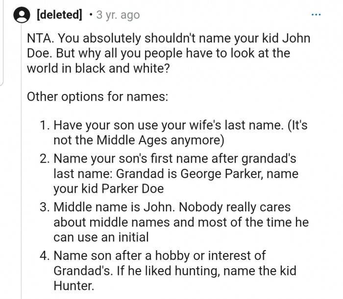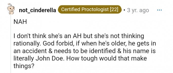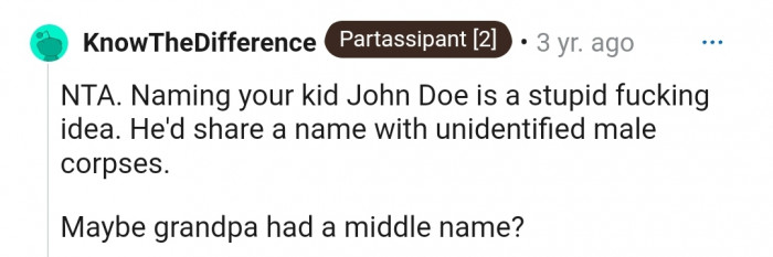 "NTA. You absolutely shouldn't name your kid John Doe."
