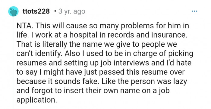 "This will cause so many problems for him in life. I work at a hospital in records and insurance. That is literally the name we give to people we can’t identify"