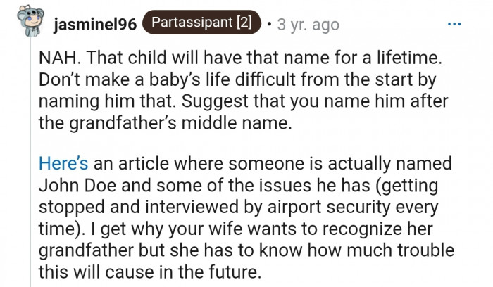 Do you think OP should allow his child to be named John Doe? Let us know your thoughts in the comments below!