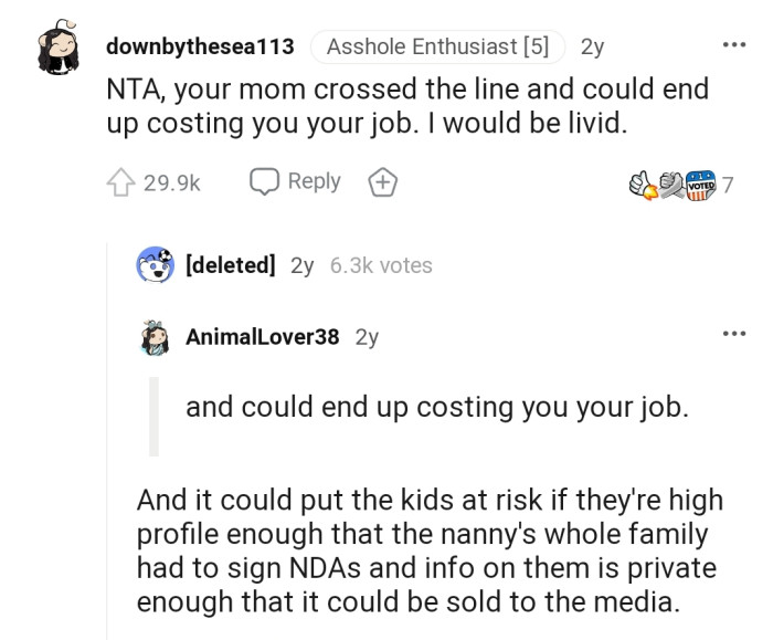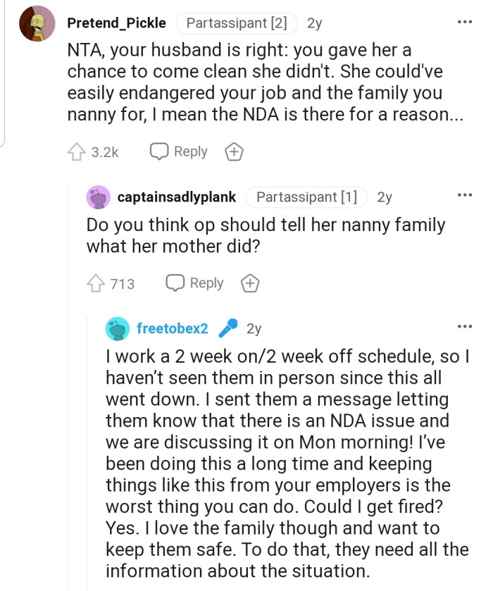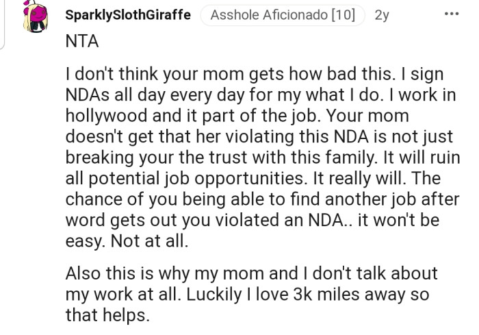 Reddit.comOP is a nanny for a high-profile family. The job comes with a strict NDA that also requires her family members to sign.