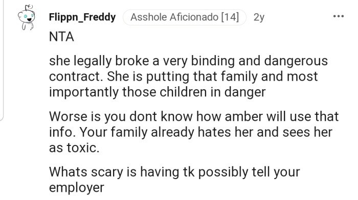 "She legally broke a very binding and dangerous contract. She is putting that family and, most importantly, those children in danger."