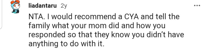"Tell the family what your mom did and how you responded so that they know you didn’t have anything to do with it."