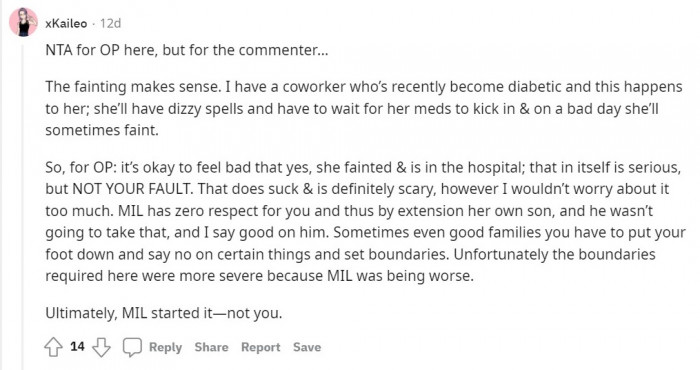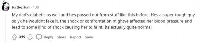 Unfortunately, things only got worse from there. When tensions escalated, resulting in the OP's husband disowning his mother, she fainted and had to be taken to the hospital, supposedly due to her diabetes.