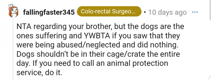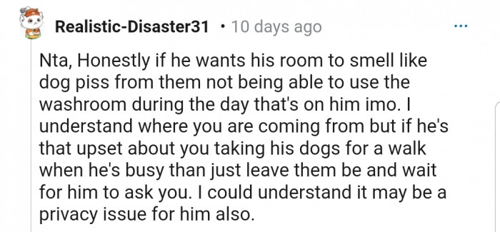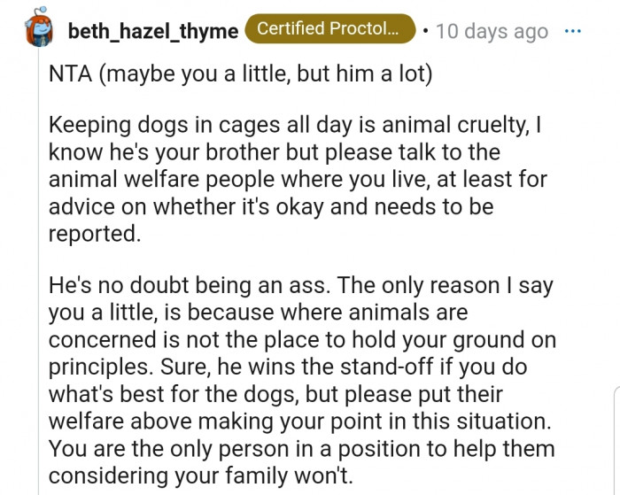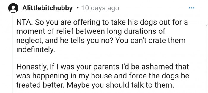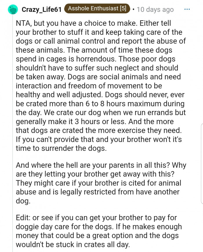 However, his brother has now put a stop to this by saying they need permission before they can go into his room to take out the dogs. This came off as very insensitive to OP, who saw it as a way for his brother to neglect his dogs even more.