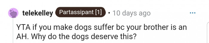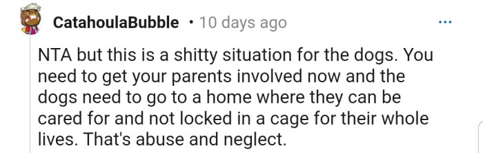 "Honestly, if I were your parents, I'd be ashamed that this was happening in my house and would force the dogs to be treated better."