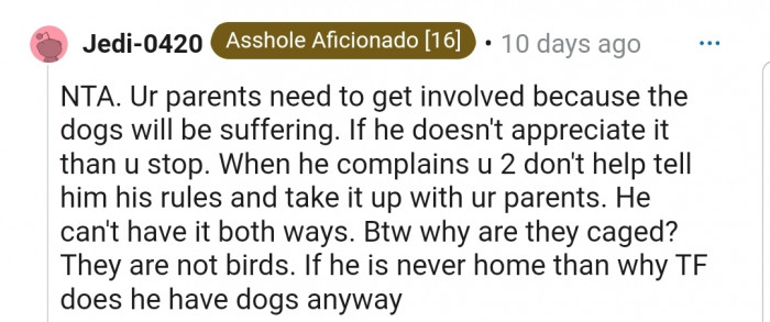 "Your parents need to get involved because the dogs will be suffering. They are not birds. If he is never home, then why does he have dogs anyway?"