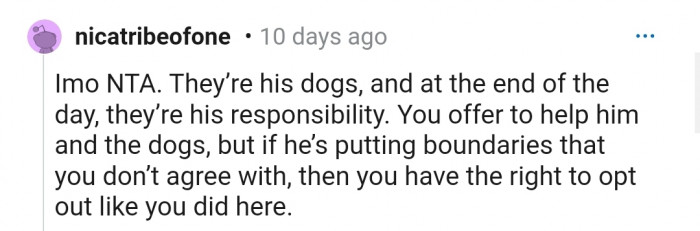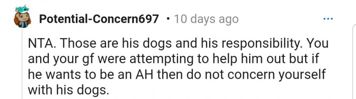 "You and your girlfriend were attempting to help him out, but if he wants to be an AH, then do not concern yourself with his dogs."