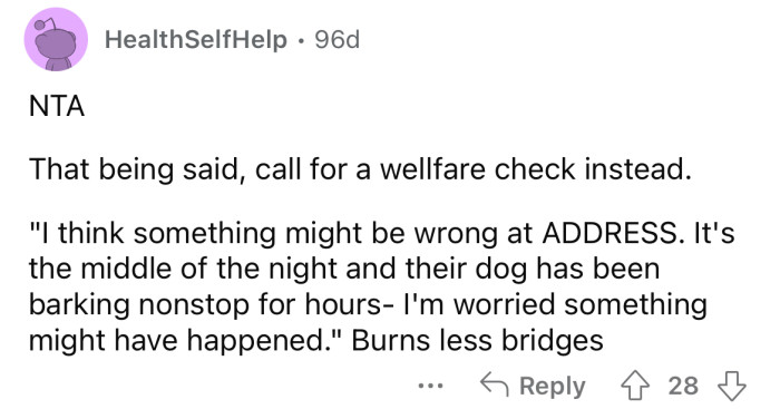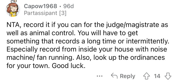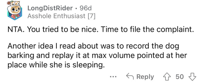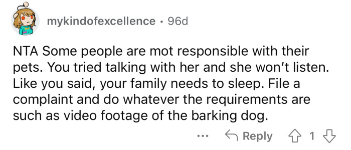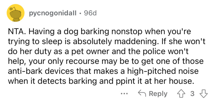 Reddit/karlsmissionOne of the OP's neighbors has a dog that barks for hours at a time, often keeping them up at night.