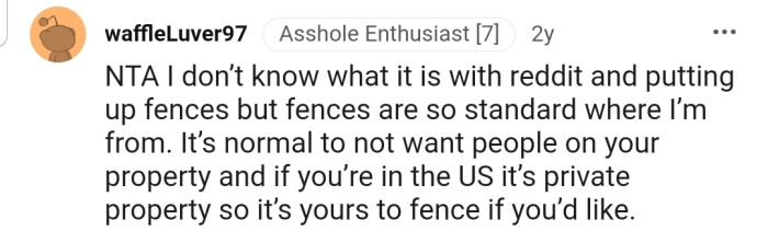 The Reddit community is fully in support of OP's decision to fence their property. Some commenters even wondered why it wasn't fenced long ago since fencing is supposed to be standard practice.