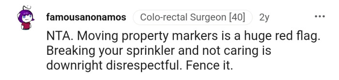 "NTA. Moving Property Markers Is a Huge Red Flag."