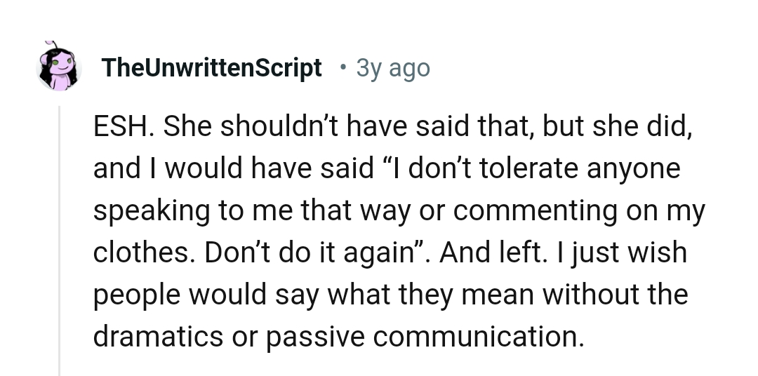 In this situation, the teen's response can be seen as a form of assertive self-expression, reclaiming her agency in the face of criticism.