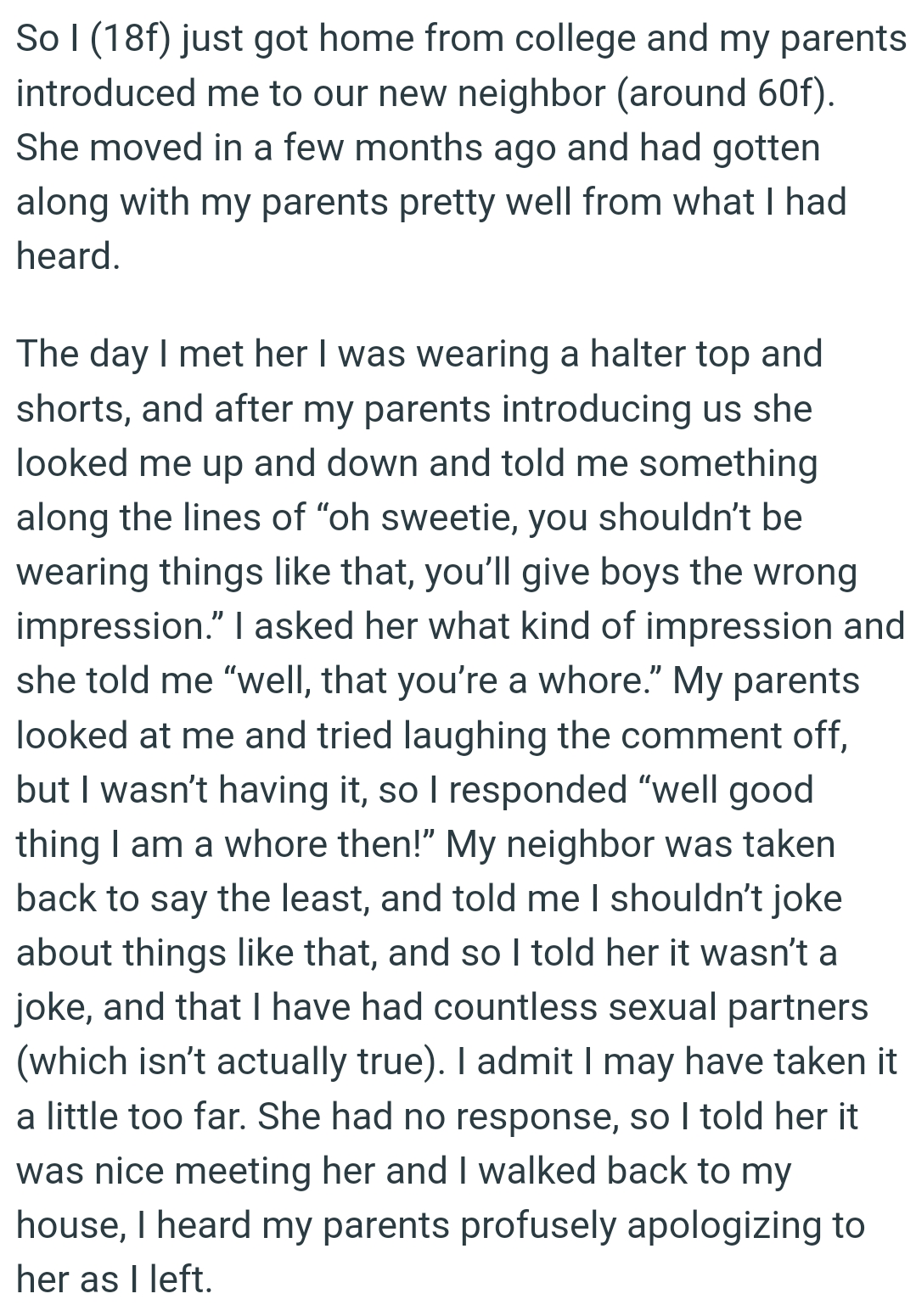 The OP of today's story was slut-shamed by her parent's neighbor. The OP was wearing a halter top and shorts when her parents introduced her to their 60-year-old neighbor.