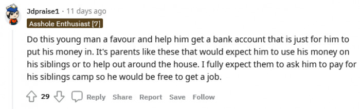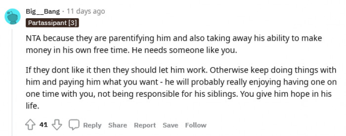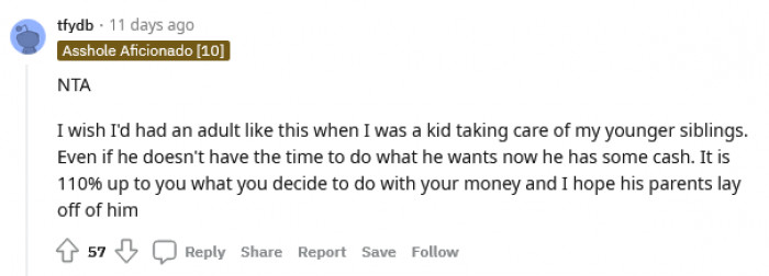 The Redditor said he felt sorry for his nephew because he had been wanting to get a summer job to earn some money for himself, but his parents wouldn't allow it. They said they couldn't afford childcare for the other four kids.