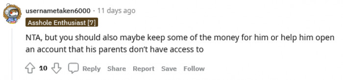 They told him it was irresponsible to give a teenager such a large amount of money, and they asked him not to do it again. But the Redditor was confused by their reaction.