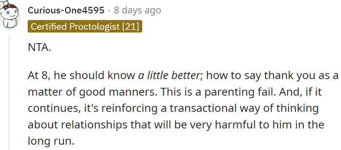 This entitlement can manifest as impolite behavior, as seen in this situation, where the child’s focus on material gain overshadows emotional connections.