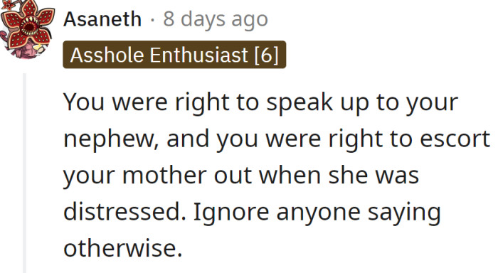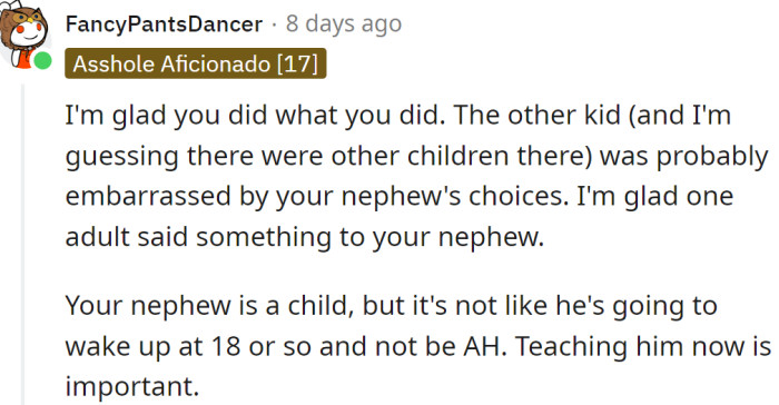 Her nephew is indeed just a child, but it's a crucial period to teach him some manners. So Redditors agreed with the OP and supported her reaction.