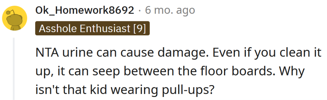 The Redditor says the little boy has already peed on the floor of her new apartment several times, and she is concerned about it possibly damaging the hardwood floors.