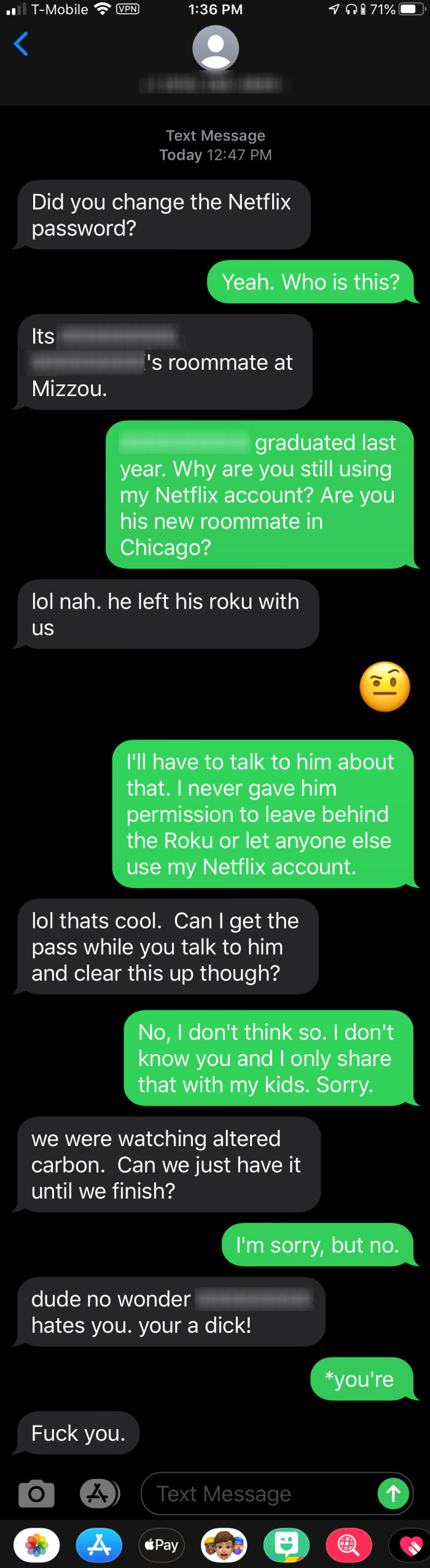 How a Redditor responded to a choosing beggar is among the great examples of dealing with an entitled person. He shares a screenshot of his conversation with his son's roommate, who feels entitled to his family's Netflix account.