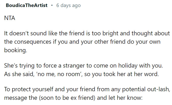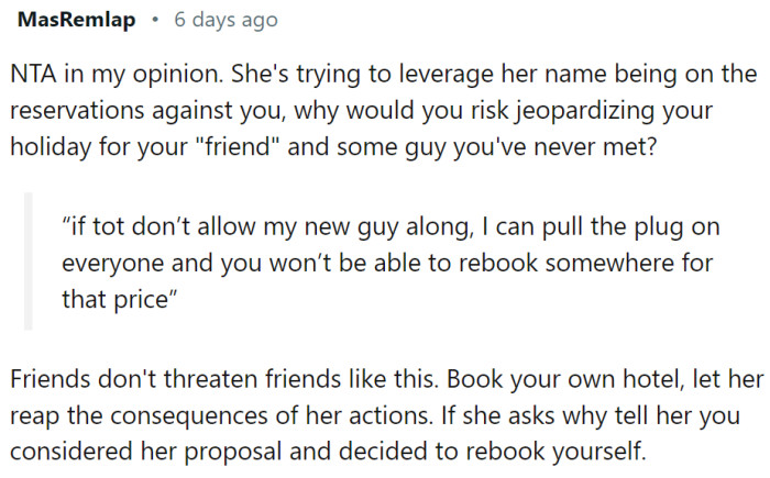 However, the moral quandary remains: by pulling out and booking a separate room, the Redditor potentially saddles the friend with a financial burden. But is this burden of their making or the result of the friend's own actions?