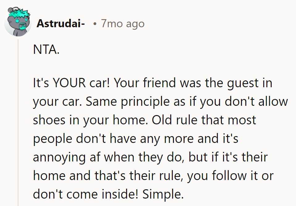 Some friends need a snack reality check. OP's car, OP's rules—end of story!