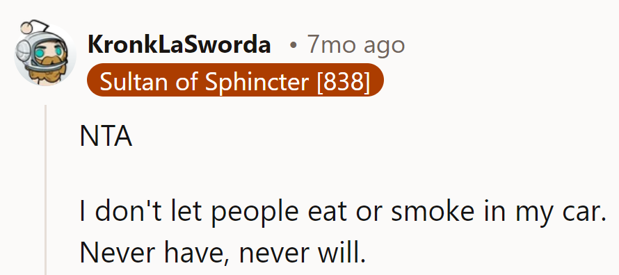 In the car, it's law—no fries, no compromise! OP's staying in their lane.