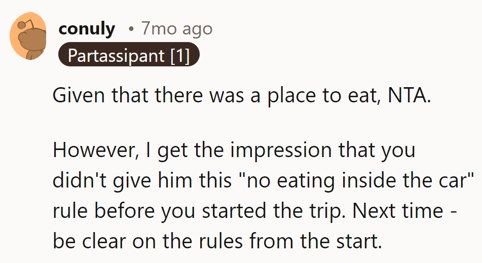 NTA for the food ban, but next time, pre-road trip rulebook!