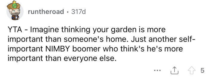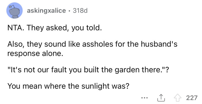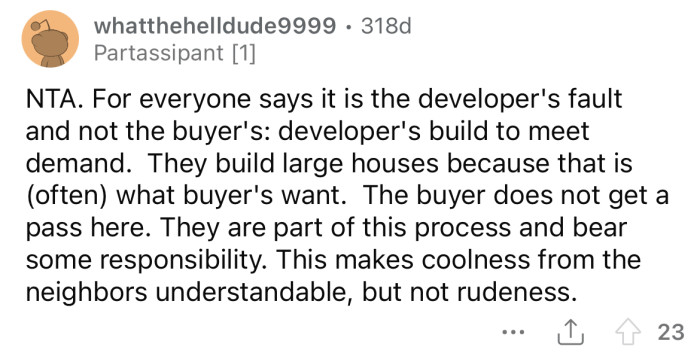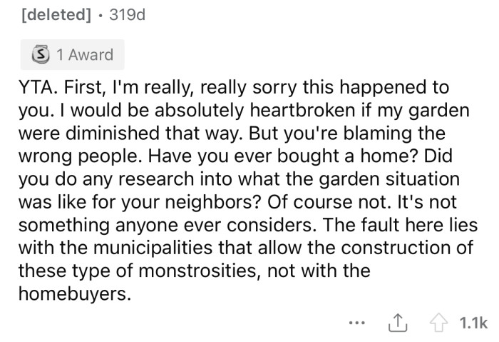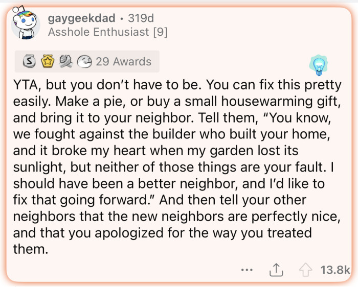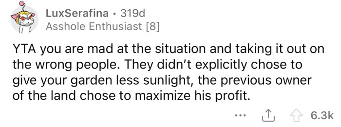 The OP told them they should have researched the area before buying a house there and expressed his anger about their house blocking light from his garden. He told them they "got what they paid for" and shouldn't have paid $2 million for "a house that everyone in the neighborhood hates."