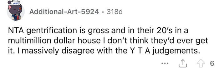 Reddit/Few_Sea5102He explained that the area he lives in has been taken over by developers, tearing down family homes and building large, unattractive houses worth millions of dollars in their place.