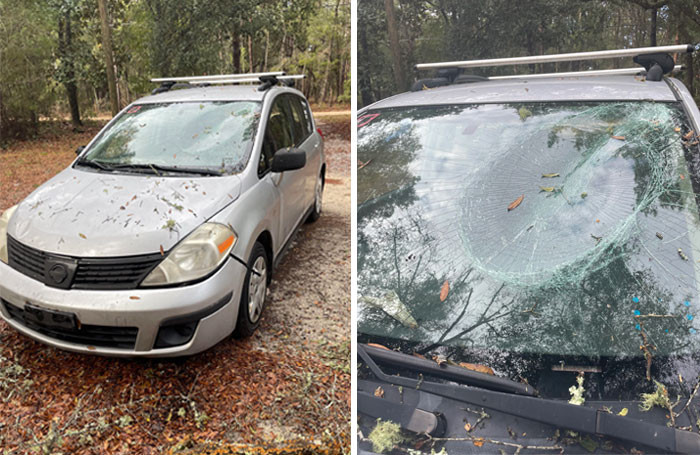 "First, My Car Gets Rear-Ended On New Year's Day. Now Godzilla Decided To Rip A Hole In My Door."
