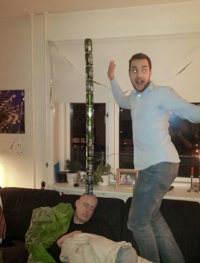 "On New Year's Eve, After People Started Going Home From The Party, A Friend Of Mine Passed Out. We Decided To Have Some Fun By Stacking 12 Cans On His Head"