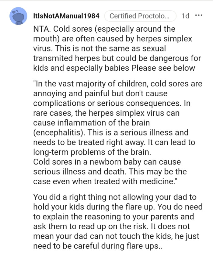Still, the OP didn't feel comfortable allowing his dad to carry his child with an open cold sore. He wouldn't let his dad carry his toddler either, which really hurt him.