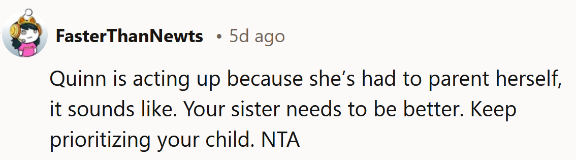 But now that Quinn is a teenager, the OP says her niece has become very sarcastic and mean. The Redditor especially dislikes the way Quinn treats her six-year-old daughter, Bella.