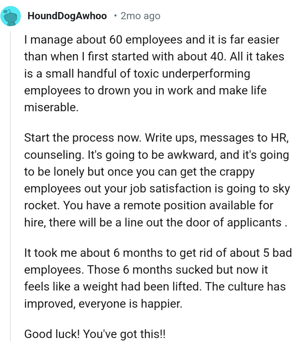 "All it takes is a small handful of toxic, underperforming employees to drown you in work and make life miserable."