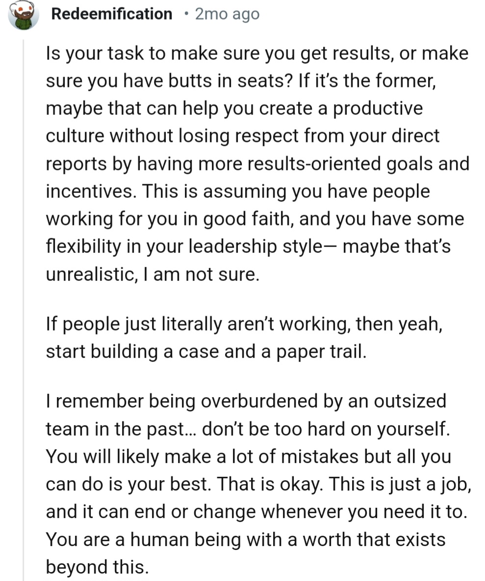 Imagine a team that's perpetually trying to game the system: clocking in for eight hours of remote work while delivering far less. This wasn’t the promotion OP had envisioned.