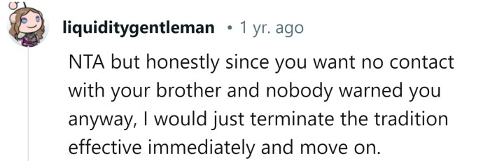 The Redditor explained that he has six siblings, but he has had no contact with his oldest brother for about eight years now. Previously, his brother had always spent Christmas with his wife's family, so it was never an issue.