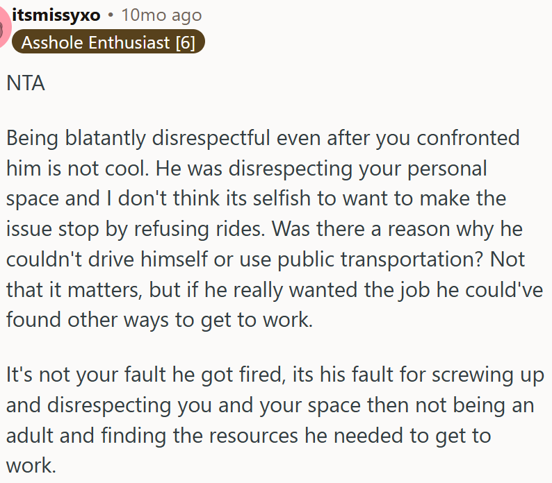 Blaming OP for someone else’s unprofessionalism misses the point entirely. Setting boundaries isn’t selfish; it’s a form of self-respect. OP had every right to stop giving rides and protect their space and time.