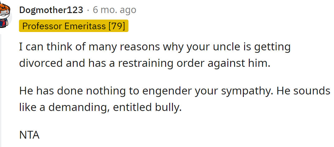RedditOP said her uncle is currently divorcing, and his wife has a restraining order against him: