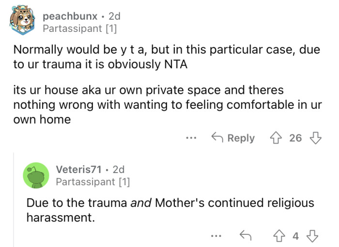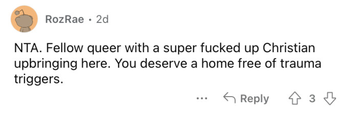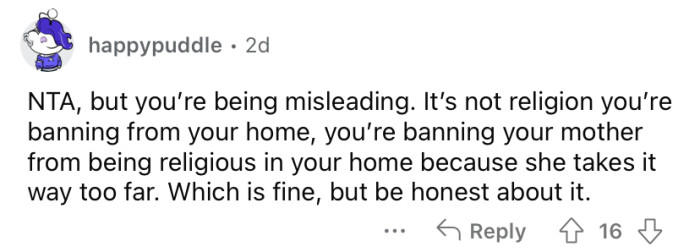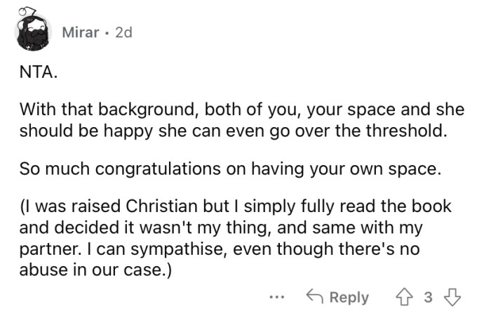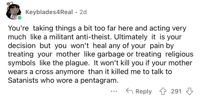So, when the OP turned 18, she moved out of her home and has kept her relationship with her mother rather distant ever since. The Redditor says her mother has mellowed a little bit with age but can still be pushy when it comes to her religious beliefs.