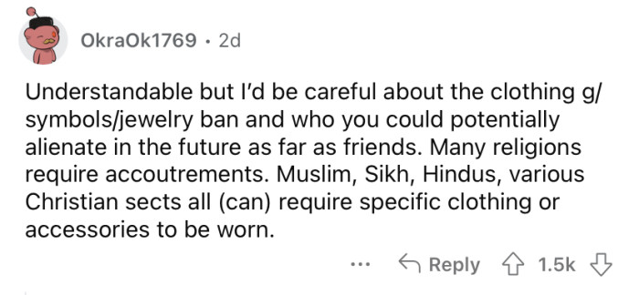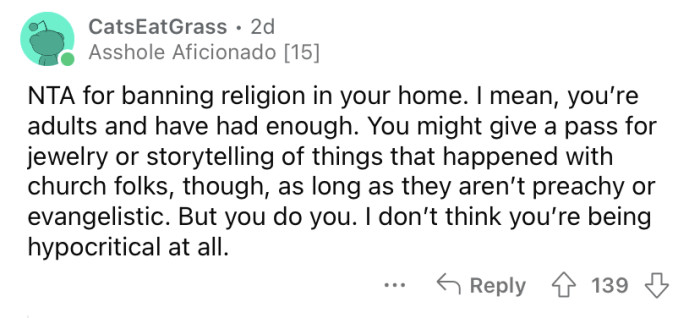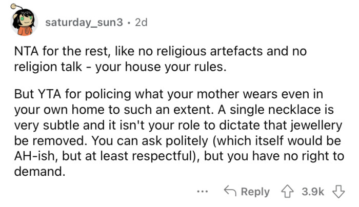 In the case of the Redditor, the decision to impose restrictions on religious symbols may stem from a desire to create a space that aligns with her beliefs and values. However, this can lead to tension, especially when family members have differing beliefs.