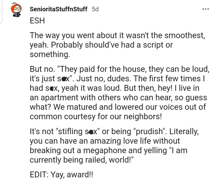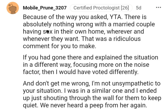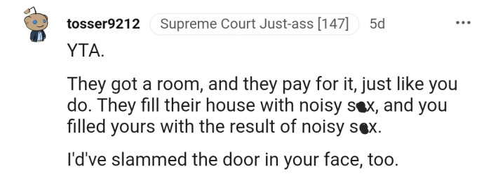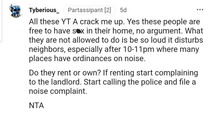 The next day, OP decided to confront his neighbors angrily about their 'nocturnal activities.' Not only did he embarrass his neighbors, but he also received a bashing of his own for intruding on their privacy.