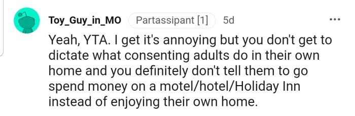 "I get it's annoying, but you don't get to dictate what consenting adults do in their own home."