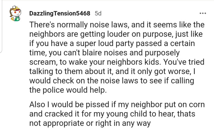 "There are normally noise laws, and it seems like the neighbors are getting louder on purpose."