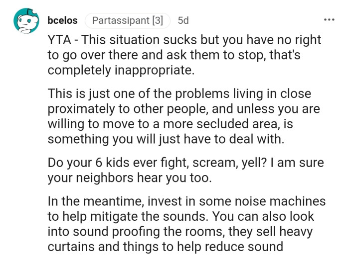Interestingly, OP's house is connected to the next apartment, and his neighbor's bedroom shares a wall with his children's bedrooms. Initially, this didn't seem like a problem until a couple moved in a few months ago.